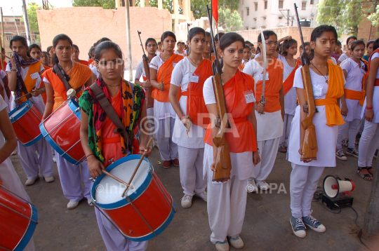 Members of the right wing Hindu Durga Vahini group before take part in a "Path Sanchalan" {March Past} Jodhpur,Rajasthan on Saturday.The Durga Vahini (Army of Durga) is the women's wing of the Vishva Hindu Parishad.