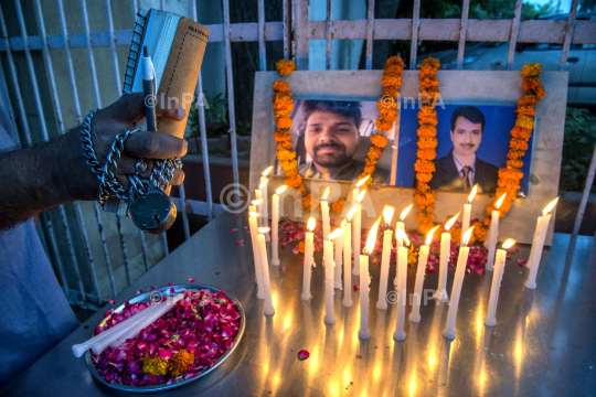 Indian journalists pay tribute to Journalist Akhilesh Pratap Singh and Rajdev Ranjan who were shot dead in Jharkhand and Bihar respectively, at Press Club of India in New Delhi, India on May 16, 2016. On Friday evening, Rajdev Ranjan, a journalist with over 20 years of experience and the bureau chief of the Hindi daily Hindustan, was shot dead in Bihar's Siwan district. In Jharkhand's Chatra district, journalist Akhilesh Pratap Singh was shot dead by unidentified people on Thursday night. 35-year-old he worked for a local news channel, and was gunned down near the panchayat secretariat of his village. Photo Credit: India Photo Agency (InPA)