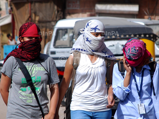Indian girls cover themselves with scarves for protection against heat on a hot day in Jodhpur, Rajasthan on Sunday, June 10, 2012 Photo by Sunil Verma/Indian Photo Agency
