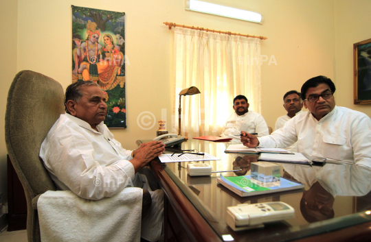 Samajwadi Party president Mulayam Singh Yadav with senior SP leader Prof. Ram Gopal Yadav and Joe Antony, Ravi Prakash Varma during party's Parliamentary Board meeting in New Delhi on June 11, 2012. Photo Credit: Indian Photo Agency