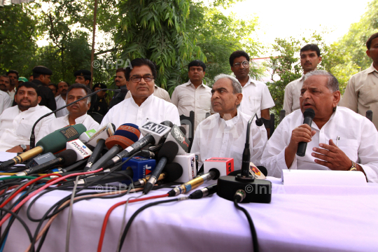 Samajwadi Party president Mulayam Singh Yadav with senior SP leader Prof. Ram Gopal Yadav and MP Mohan Singh, Joe Antony, Ravi Prakash Varma during a press conference in New Delhi on June 11, 2012. Backing the Centre's stand on the minority quota issue, Mulayam said that Muslims should be given reservation according to the Sanchar committee report. Photo Credit: Indian Photo Agency