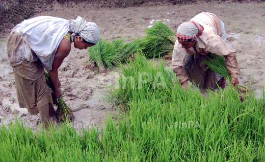 Women farmers collecting paddy seedlings for plantation in a field on the outskirts in Sivasagar, Assam, India on June 15, 2012. Photo by Luit Chaliha/Indian Photo Agency