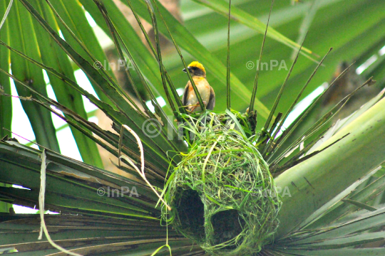A Speke's Weaver Bird near its nest on a tree in Nagaon,Assam on Saturday, June 16, 2012. Photo by Anuwar Hazarika/Indian Photo Agency