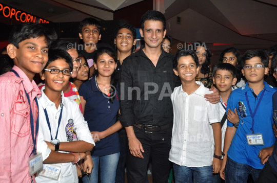 Bollywood actors Sharman Joshi and Ritvik Sahore with children during special screeningof film "Ferrari Ki Sawaari" in Mumbai on 22 June 2012. Photo Credit: Indian Photo Agency
