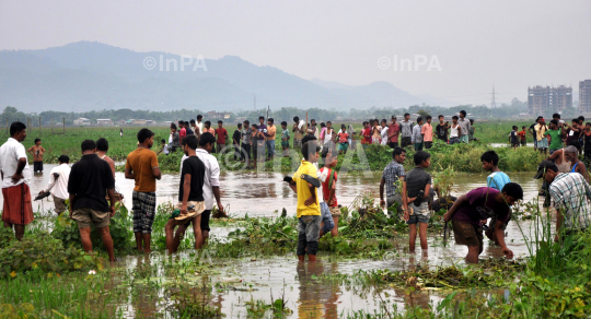 Hundreds of people thronged near a swamp at Chachal in Guwahati on Monday 25th June 2012, to collect currency notes of Rs 1,000 and Rs 500 which were found floating in the swamp, as the news about the currency notes spread, people in the area thronged the spot. People were seen fishing out currency notes of Rs 1,000 and Rs 500 from the swamp near the Ginger Hotel in Chachal. Some people even came prepared with fishing nets to check deep into the swamp for the wet currency notes. Photo by Dasarath Deka/Indian Photo Agency