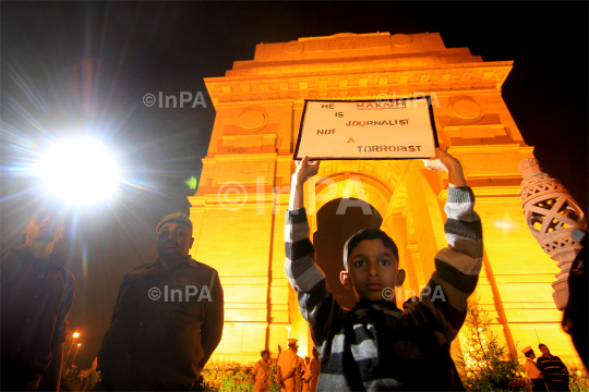 A child holding a playcard to support Sayed Mohammed Ahmed Kazmi, during a candle light vigil at India Gate for his release in New Delhi, India, Monday, March 12, 2012. Kazmi, a senior journalist, was held by police for his alleged role in facilitating the February 13 bombing of an Israeli diplomat's car. Photo Credit: Indian Photo Agency