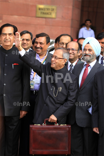 Indian Union Finance Minister, Pranab Mukherjee leaves North Block for Parliament House to present the General Budget 2012-13, in New Delhi on March 16, 2012. Minister of State for Finance, Namo Narain Meena, the Finance Secretary, RS Gujral and other officials of the Ministry are also seen. Photo Credit: Indian Photo Agency