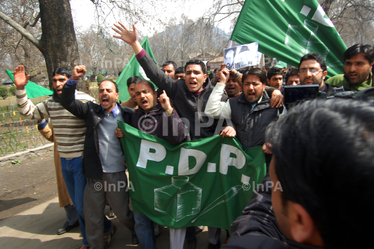 Activists of youth wing of Peoples Democratic Party (PDP) during a protest demanding a thorough probe in the multi-crore scam in Jammu and Kashmir Cricket Association (JKCA) also demanded action should also be taken against JKCA president Dr Farooq Abdullah and Common Wealth Game (CWG) chairman Suresh Kalmadi, in Srinagar on on March 16, 2012. Photo By Tariq Mir/Indian Photo Agency