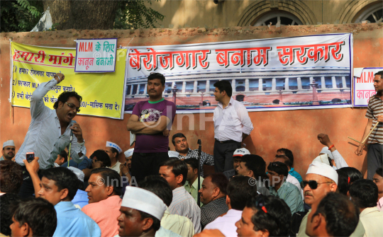 Supporters of multi-level marketing company Retail Commercial Marketing (RCM) during a protest rally in support of the firm organised by RCM Consumer's & Distributor's Welfare Association at Jantar Mantar in New Delhi on March 19, 2012. They demanded that the Centre chalk out some laws favouring multi-level marketing companies. Photo Credit: Indian Photo Agency
