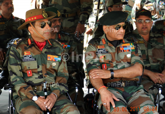 Chief of Army Staff, General VK Singh with Lieutenant General Gyan Bhushan, Army Commander, South Western Command reviews the conduct of Exercise ëShoor Veerí, in Hanumangarh, Rajasthan on May 03, 2012. Photo Credit: Indian Photo Agency