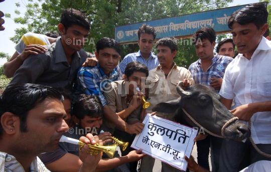 University students and members of NSUI playing trumpet (bean in Hindi) in front of buffalo as they protest against Jai Narayan Vyas university's Vice Chancellor Dr. BS Rajpurohit at VC office at Jodhpur in Rajasthan, India on Saturday, 05 May 2012. Photo by Sunil Verma/Indian Photo Agency