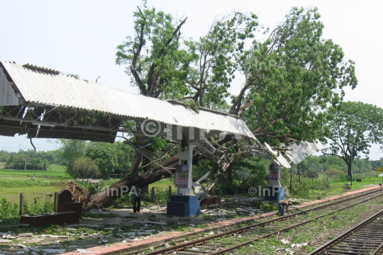A branch of a tree felt on an electric wire due to cyclone at Dhupguri Railway Station in Jalpaiguri, West Bengal on 04 May 2012. Photo by Roni Chowdhury/Indian Photo Agency