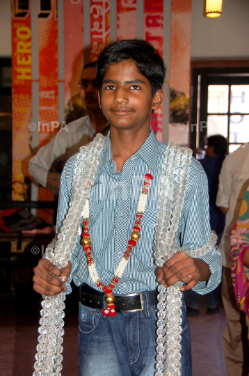 A 12 year old boy Ajay Parikh after make a chain of beads in front of government officers to attempt for Guinness World Record at Khash Bagh in Jodhpur on Tuesday, 08/05/2012. He made 105 feet long chain of beads in one hour,he use 1596 beads in this chain.He break old record of 64.2 feet long chain of beads. Photo by Sunil Verma/Indian Photo Agency