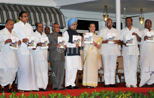 Indian Prime Minister Manmohan Singh and Congress party president Sonia Gandhi along with Pranab Mukherjee, AK Antony, P Chidambaram, Mulayam Singh Yadav, Sharad Pawar and other leaders of the ruling "United Progressive Alliance" (UPA) release "Report to the People", to mark the completion of three years of the government in New Delhi, India, Tuesday, May 22, 2012. Photo Credit: Indian Photo Agency