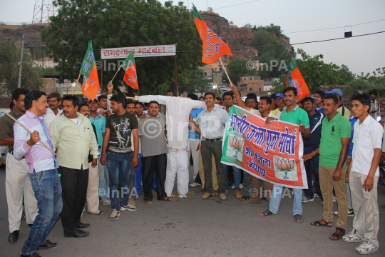 Members of Bhartiya Janta Party (BJP) during a protest against Government and burn the effigy of prime minister Manmohan Singh after the announcement of a 7.50 rupees price hike in petrol by the government of India with effect from midnight Wednesday night, in Jodhpur, Rajasthan on Wednesday, May 23, 2012. Photo by Sunil Verma/Indian Photo Agency