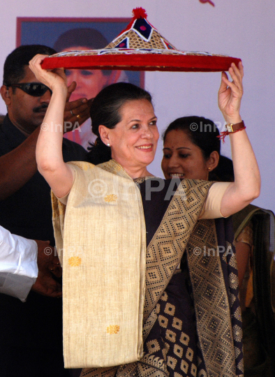 UPA Chairperson Sonia Gandhi being presented with a traditional Assamese "Japi" (Hat) during the first anniversary celebration of the third consecutive term of the Congress government in the State, in Guwahati on Saturday, May 26, 2012. Photo by Ujjal Deb/Indian Photo Agency