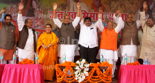BJP president Nitin Gadkari during Vijay Sankalp Samagam on the occasion of convergence of two Jan Swabhiman Yatras led by Rajnath Singh and Kalraj Mishra respectively at Ayodhya in Uttar Pradesh on 17/11/2011. Vinay Katiyar, Mukhtar Abbas Naqvi, Uma Bharti,Surya Pratap Shahi are also in the picture. Photo by Shashibhushan Pandey/Indian Photo Agency