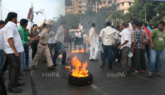 Angry protesters of National Congress Party burn tyres on a road during a protest demonstration against NCP Pressident Sharad Pawar slap at Borivali , in Mumbai on 24 November 2011. Photo by Sachin Halde/Indian Photo Agency