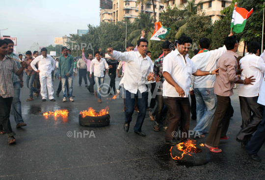 Angry protesters of National Congress Party burn tyres on a road during a protest against NCP Pressident Sharad Pawar slapped, at Borivali in Mumbai on 24 November 2011. Photo by Sachin Halde/Indian Photo Agency