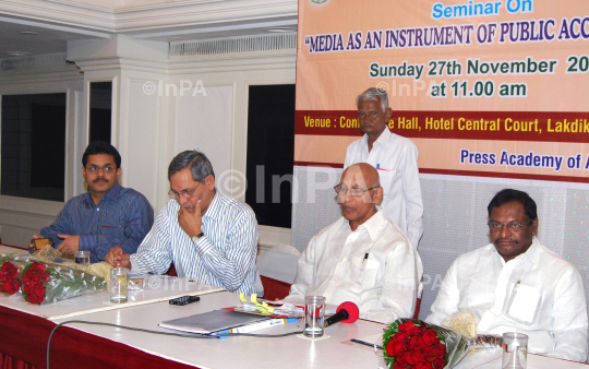 Justice G Raghuram, Justice, High Court of Andhra Pradesh participating in the seminar held in connection with Commemoration of National Press Day in Hyderabad on 27.11.2011. Tirumalagiri Surender, Chairman, Press Academy of A.P, Dr. K Ramachandra Murthy, Editor-in-Chief, HMTV and BVenkatesham, IAS., Commissioner, I&PR are also seen. Photo Credit: Indian Photo Agency