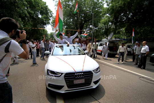 Supporters of Indian anti-corruption activist and Team Anna member Arvind Kejriwal waves Indian National Flag from a Audi car at Parliament Street to protest against the arrest of supporters following the August 26 anti-government protest in New Delhi, India, Monday, Sept. 3, 2012. Arvind recorded his statement before police in connection with the August 26 protest, saying he is ready to face punishment if the government thinks that he provoked rioting. Photo by Shweta/Indian Photo Agency