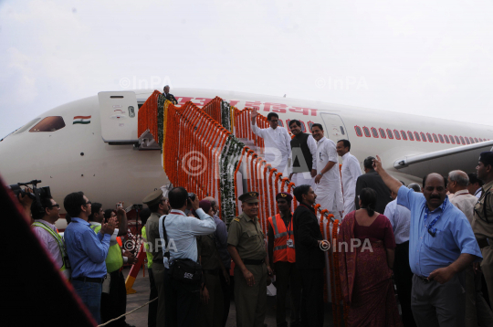 Indian Aviation minister Ajit Singh with BJP leader Shahnawaz Hussain, Rajiv Pratap Rudy and Congress MP Naveen Jindal, during launch of Air India's first Dreamliner at a function at the IGI airport in New Delhi on September 12, 2012. Photo Credit: Indian Photo Agency