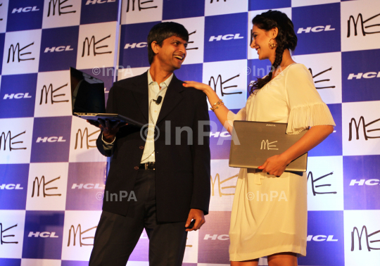 Princy Bhatnagar, Vice President, Consumer Computing, HCL with Bollywood actress Nargis Fakhri during unveiling of HCL Infosystems Ultrasmart ME Ultrabook in New Delhi, India, Wednesday, Sept. 19, 2012. Photo by Shweta/Indian Photo Agency