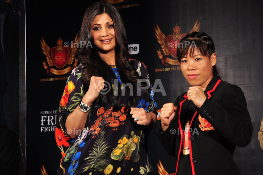 Bollywood actress Shilpa Shetty Kundra with Indian Boxer Mary Kom during the press conference of Super Fight League to announce new project in Mumbai, India on September 24, 2012. Photo Credit: Indian Photo Agency