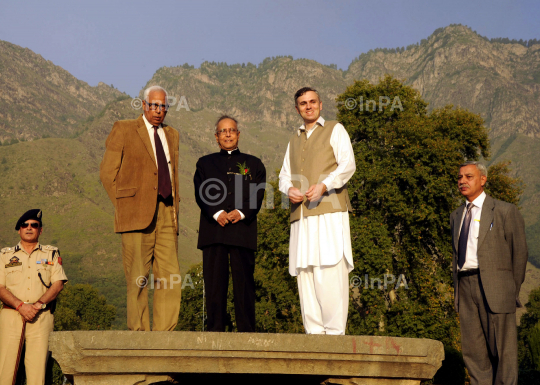 Indian President, Pranab Mukherjee, visiting Nishat Garden , accompanied by the Governor of Jammu and Kashmir, NN Vohra and the Chief Minister of Jammu and Kashmir, Omar Abdullah, at Srinagar on September 27, 2012. Photo by Tariq Mir/Indian Photo Agency