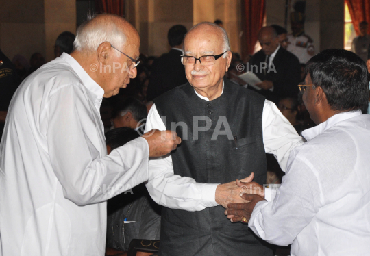 Union Minister for New and Renewable Energy, Dr Farooq Abdullah and Minister of State in Prime Minister's Office (PMO), V Narayanasamy talk to BJP Leader LK Advani at the swearing-in ceremony of the new Chief Justice of India Justice Altamas Kabir at Rashtrapati Bhavanin New Delhi on Sept 29, 2012. Photo Credit: Indian Photo Agency