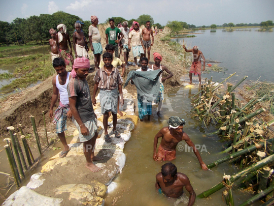 Indian villagers repair barrage of ganga river at Manikchak in Malda District, West Bengal, India on September 07, 2013. Photo by Pankaj/Indian Photo Agency (InPA)