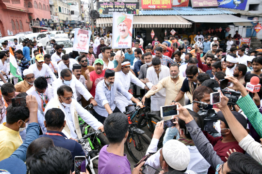 Bhopal: Against the price hike of petrol and diesel, Youth Congress under the leadership of State President Vikrant Bhuria tried to gherao Raj Bhavan by taking out a cycle rally. Stopped by the police force near Lily Talkies.Bhopal, Madhya Pradesh, India on 17 July 2021. Photo By Indian Photo Agency(InPA).