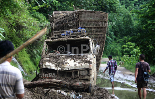 People walk passes a vihecles partially damaged by landslide at the landslide area in the National Highway 39 at Chumukedima, Nagaland on Sunday, August 14, 2011. About 100 of manpower and 10 machineries are engaged to restore the highway which was wash away by landslide due to heavy rain on Saturday morning. Photo by Caisii Mao/Indian Photo Agency