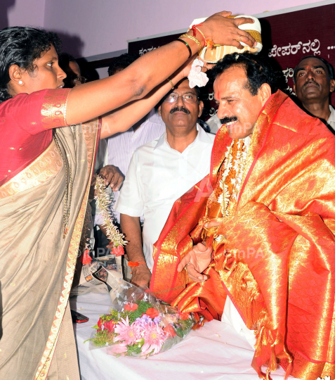 Karnataka Chief Minister D V Sadananda Gowda being presented a peta by his one of the BJP women Party Worker after his maiden two-day visit to his home district in Mangalore on 14/08/2011. Photo by RK Bhat/Indian Photo Agency