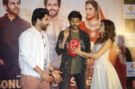 Bollywood actors Kartik Aaryan, Sunny Singh and the leading Lady Nushrat Bharucha during a press conference for film "Sonu Ke Titu Ki Sweety" in New Delhi, India, on Feb 14, 2014. They interacted with media and shared their views and secrets about the movie as well as Valentine’s Day. Photo Credit: Indian Photo Agency (InPA)