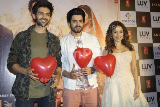 Bollywood actors Kartik Aaryan, Sunny Singh and the leading Lady Nushrat Bharucha during a press conference for film "Sonu Ke Titu Ki Sweety" in New Delhi, India, on Feb 14, 2014. They interacted with media and shared their views and secrets about the movie as well as Valentine’s Day. Photo Credit: Indian Photo Agency (InPA)