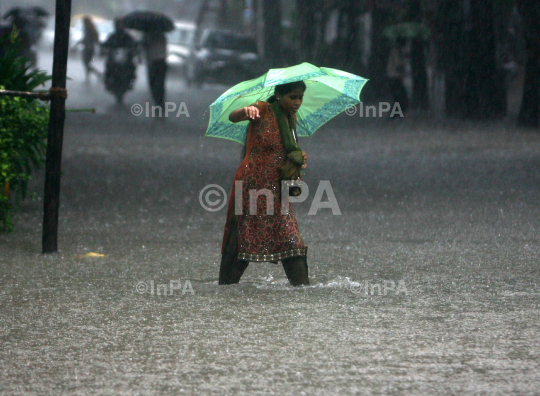 Walkers past a water-logged street during heavy rains in Mumbai parel today 29 August 2011.