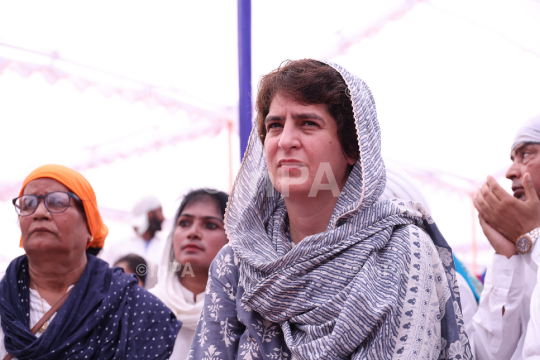 AICC General Secretary Priyanka Gandhi Vadra paying tributes to Lakhimpur Kheri martyr farmers and journalist Raman Kashyap at their 'Antim Ardas' in Lakhimpur Kheri, Uttar Pradesh, India on October 11, 2021. Photo Credit: Indian Photo Agency (InPA)