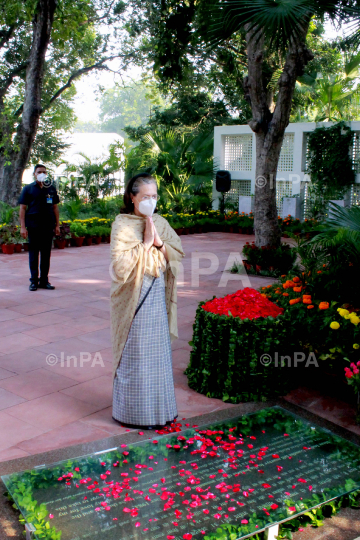 Congress President Sonia Gandhi offering floral tributes to former Prime Minister Indira Gandhi on her Martyrdom Day at the place of Martyrdom, 1 Safdarjung Road in New Delhi, India on Oct 31, 2021. Photo by Indian Photo Agency (InPA)