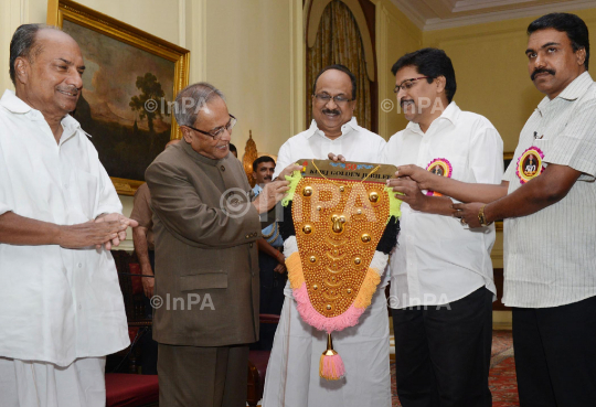 President of India, Pranab Mukherjee during, Inauguration of The Valedictory Function of The Golden Jubilee Celebration of Kerala Union of Working Journalists at Rashtrapati Bhavan in New Delhi, India on Aug 31, 2013. Indian Defence minister AK Antony and Union Food Minister KV Thomas are also in the picture. Photo Credit: Indian Photo Agency (InPA)