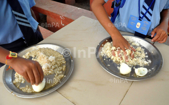 Mid-day meal: Indian school girl and boys eat free midday meal at Umakanta Academey government school in Agartala, Tripura, India, on Tuesday, 27th August 2013. The Indian government last month decided to come out with an ordinance to give two-third of the nation's population the right to 5 kilograms of food grains every month at a highly subsidized rate of 1-3 rupees per kilogram, which, if implemented, will be the largest food security program in the world, 26th August, 2013, Food security bill passed in Loksabha. Photo by Abhik Deb/Indian Photo Agency (InPA)