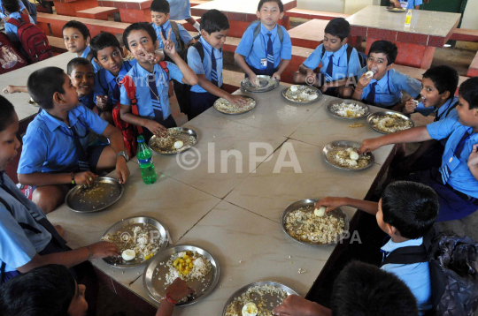Mid-day meal: Indian school girl and boys eat free midday meal at Umakanta Academey government school in Agartala, Tripura, India, on Tuesday, 27th August 2013. The Indian government last month decided to come out with an ordinance to give two-third of the nation's population the right to 5 kilograms of food grains every month at a highly subsidized rate of 1-3 rupees per kilogram, which, if implemented, will be the largest food security program in the world, 26th August, 2013, Food security bill passed in Loksabha. Photo by Abhik Deb/Indian Photo Agency (InPA)