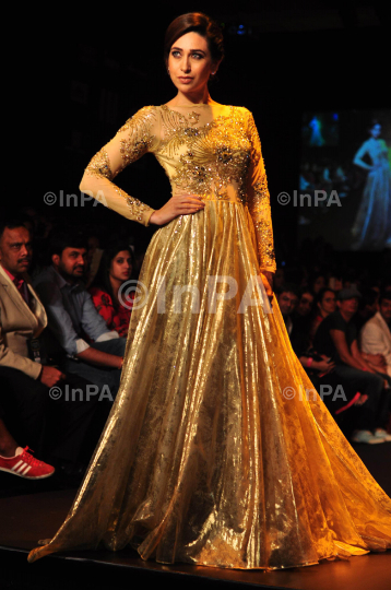 Bollywood actres Karishma Kapoor (Karisma Kapoor) walks the ramp for Fashion designer Vikram Phadnis during the Lakme Fashion Week Winter/ Festive 2013 in Mumbai, India on August 25, 2013. Photo Credit: Indian Photo Agency (InPA)