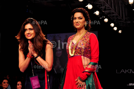 Bollywood actress Juhi Chawla walks the ramp for Fashion designer Shruti Sancheti during the Lakme Fashion Week Winter/ Festive 2013 in Mumbai, India on August 25, 2013. Photo Credit: Indian Photo Agency (InPA)