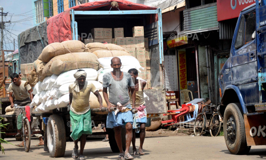 An Indian laborer carries of Rice and other food at a wholesale market in Agartala, Tripura, India, on August 22, 2013. The Indian economy, Asia's third largest, grew 5 percent in the financial year ended March. The Indian rupee has plumbed new lows against the dollar on a near daily basis, showing the pressure of a current account deficit that has swelled from high import costs. Photo by Abhik Deb/Indian Photo Agency (InPA)