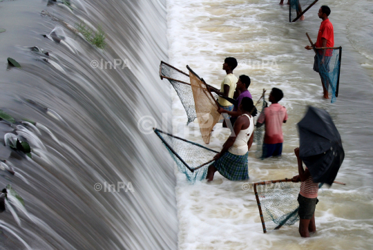 Villagers Busy in catching Fish at an overflowing Dam in Purulia, West Bengal, India on August 20, 2013. Photo by Amit Singha Deo/Indian Photo Agency (InPA)