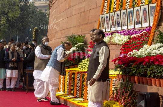 Vice President M Venkaiah Naidu, Lok Sabha Speaker Om Birla, Defence Minister Rajnath Singh, LoP of Rajya Sabha Mallikarjun Kharge, Deputy Chairman of the Rajya Sabha Harivansh Narayan Singh and other Parliamentarians paying tributes to victims of the 2001 terror attack on the Indian Parliament on its anniversary in New Delhi, India on Dec.13, 2021. Photo by Shailendra Pandey/Indian Photo Agency (InPA)
