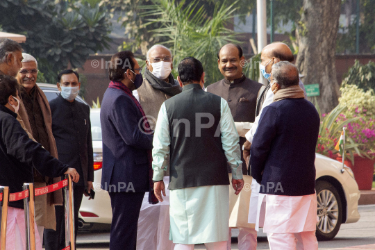 Lok Sabha Speaker Om Birla, Defence Minister Rajnath Singh, LoP of Rajya Sabha Mallikarjun Kharge, and other Parliamentarians during an event to pay tributes to victims of the 2001 terror attack on the Indian Parliament on its anniversary in New Delhi, India on Dec.13, 2021. Photo by Shailendra Pandey/Indian Photo Agency (InPA)