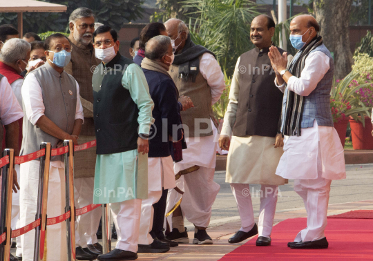 Lok Sabha Speaker Om Birla, Defence Minister Rajnath Singh, LoP of Rajya Sabha Mallikarjun Kharge, and other Parliamentarians during an event to pay tributes to victims of the 2001 terror attack on the Indian Parliament on its anniversary in New Delhi, India on Dec.13, 2021. Photo by Shailendra Pandey/Indian Photo Agency (InPA)