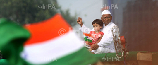 Social activist Anna Hazare sits in the backdrop of a portrait of Mahatma Gandhi at the venue of a public hunger strike in New Delhi, India, Friday, Aug. 19, 2011. Hazare began the strike and mass protest Friday, adopting the tactics of liberation hero Mahatma Gandhi to push for government reform. Photo Credit: Indian Photo Agency